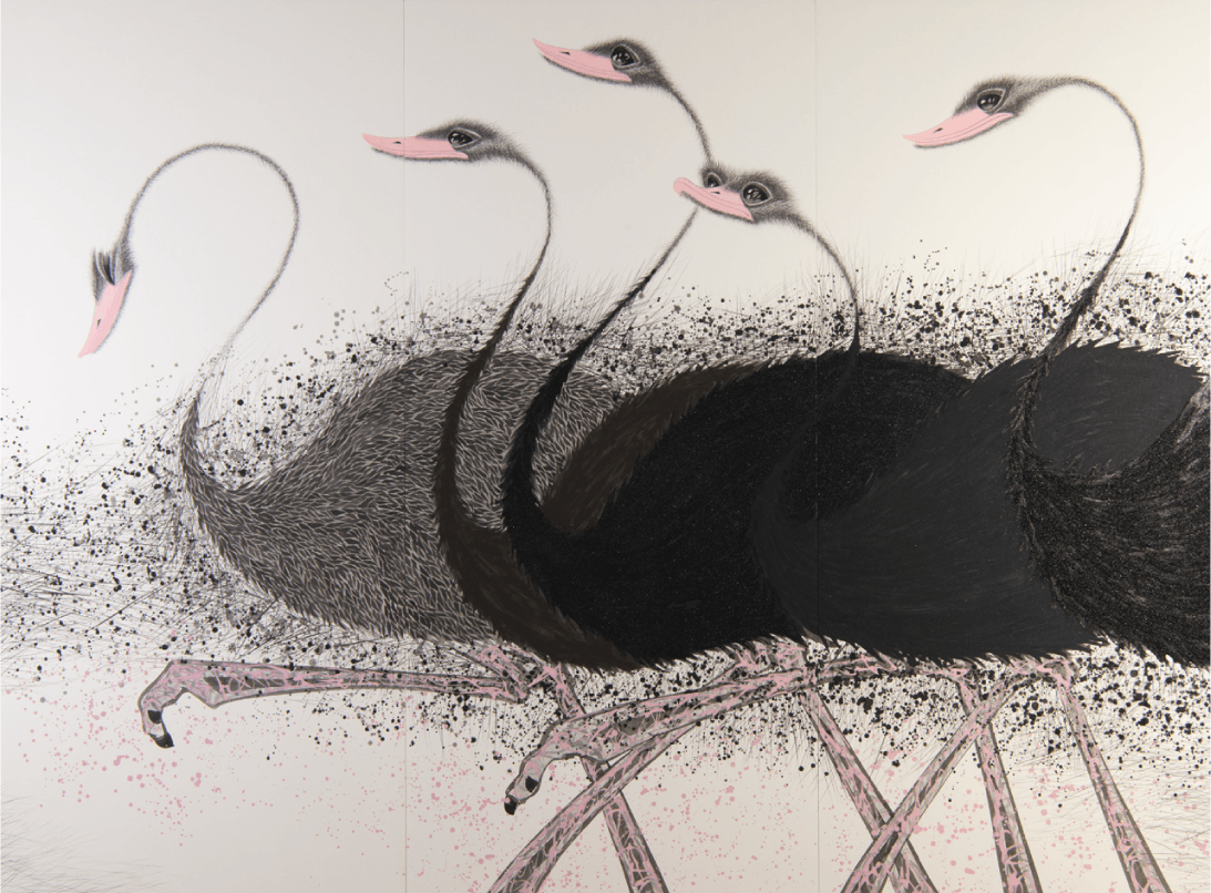 黒漆喰で仕上げたメインダイニングには、福井江太郎氏の代名詞とも言える駝鳥をモチーフにした作品を展示。料理人がお客様の目の前で調理を行うオープンキッチンも設えています。揚げたてが美味しい天ぷらや炭火焼き、寿司など、美味なるパフォーマンスも一緒にお楽しみいただけます。(定員: 12名)